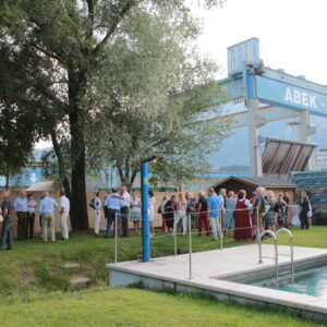 Anlässlich der feierlichen Präsentation von „Meteoros“ lud die Firma ABEK zu Ehren des Künstlers Karl Eidenhammer zur Vernissage am Firmengelände der Firma ABEK. Anschließend fand ein gemütliches Beisammensein mit Snacks und Drinks am ABE-Pool statt.